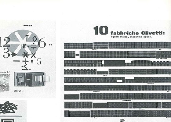 Dall’alto: Ivrea, S. Bernardo, Agliè, Torino, Apuania, Pozzuoli, Barcelona, Glasgow, São Paulo, Buenos Aires. Anno 1957, grafica di Giovanni Pintori.