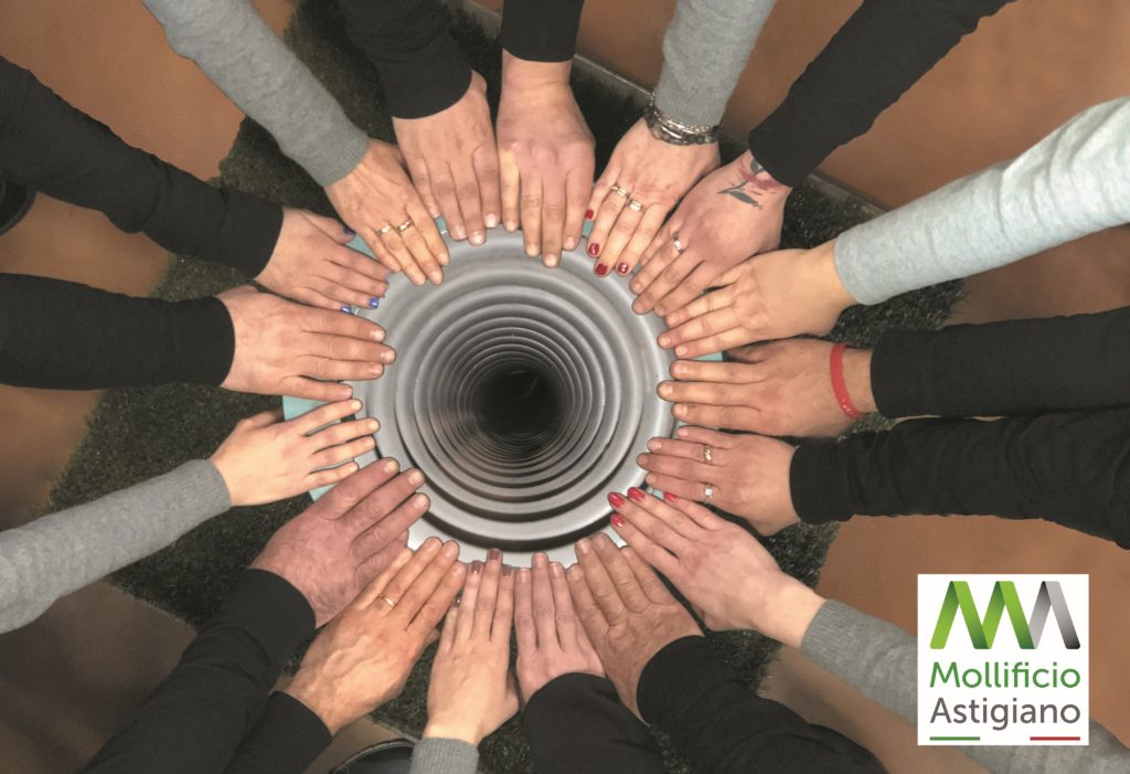 Il Mollificio Astigiano si ispira al pensiero e all’opera di Adriano Olivetti. Lo dimostra in tanti aspetti della sua gestione, a partire dal personale (nove uomini e otto donne, la prossima assunzione sarà una donna per raggiungere la parità) dall’ambiente e dalla comunità. Il personale ha un’età media di trentacinque anni. Alta è la partecipazione ai processi aziendali – un lavoratore a cui ho chiesto se gli piacerebbe ci fosse un Consiglio di Gestione sul modello Olivetti mi ha risposto che in pratica ce l’hanno già, anzi gran parte delle decisioni vengono prese insieme; gli orari sono flessibili per consentire di conciliare le esigenze di vita, di famiglia e di lavoro. Le retribuzioni sono significativamente superiori a quelle del contratto nazionale. L’azienda sostiene gli studi dei figli. Tra i benefit per i dipendenti: teatro, mostre, viaggi, rette per gli asili, yoga. In azienda si può andare in palestra e in sala relax. Alto è l’investimento in formazione permanente. Frequenti i viaggi collettivi di tipo culturale e di visita a imprese con sistemi gestionali organizzativi avanzati. La fabbrica è molto luminosa, dotata di grandi vetrate dalla quali si vede la campagna e i vigneti. 50.000 kWh/anno sono prodotti con energia solare; 72.000 litri di acqua piovana vengono raccolti in vasche di contenimento sotterrate per l’irrigazione; ionizzazione l’acqua viene ionizzata e resa disponibile per tutti; il personale viene dotato di borracce di metallo invece di bottiglie di plastica; in fabbrica sono presenti piante sufficienti a garantire la depurazione dell’aria; l’azienda è certificata UNI EN ISO 14001:2015 – Sistema di gestione ambientale internazionale.