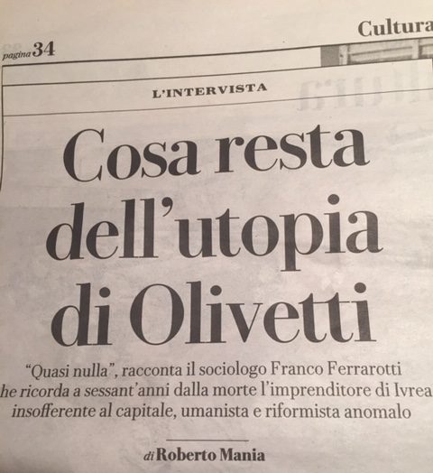 27 febbraio 2020, sessanta anni dopo la scomparsa di Adriano Olivetti , Repubblica lo ricorda con una bella intervista di Roberto Mania al valoroso sociologo Franco Ferrarotti, della quale pubblichiamo due delle domande e risposte conclusive.