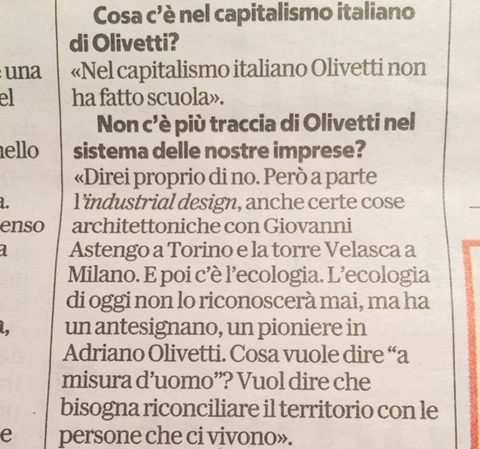 <<Direi proprio di no. Però a parte l’industrial design, anche certe cose architettoniche con Giovanni Astengo a Torino e la torre Velasca a Milano. E poi c’è l’ecologia. L’ecologia di oggi non lo riconoscerà mai, ma ha un antesignano, un pioniere in Adriano Olivetti. Cosa vuole dire “a misura d’uomo”? Vuol dire che bisogna riconciliare il territorio con le persone che ci vivono>>.