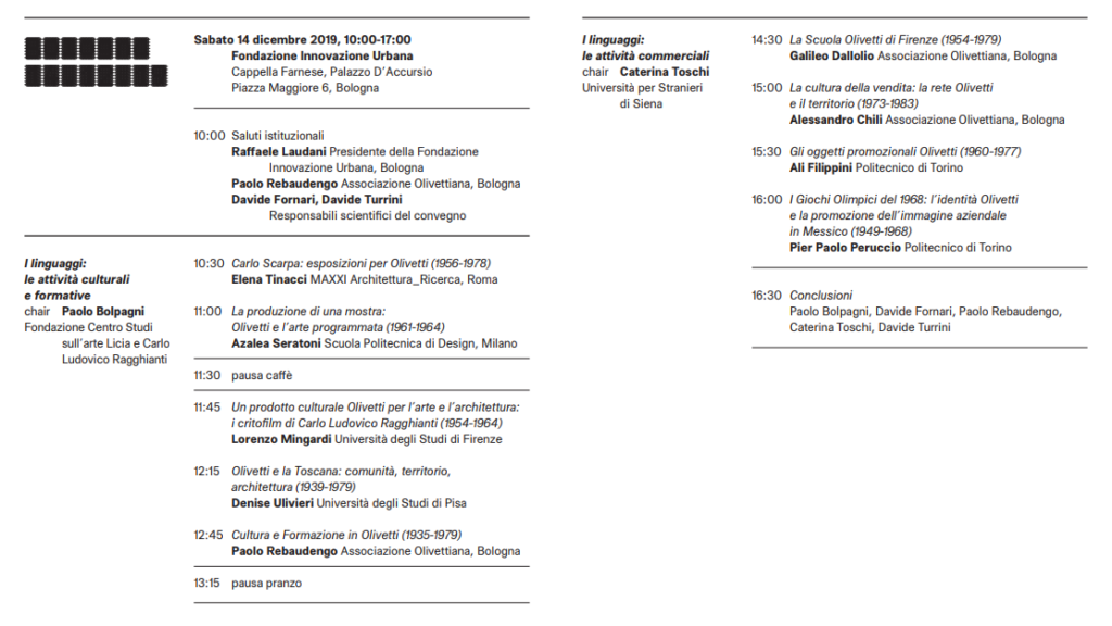 è scaricabile il programma definitivo della tre giorni su “Identità Olivetti -spazi e linguaggi – 1933 1983” che si terranno nei giorni 12,13,14 dicembre rispettivamente alla Università di Venezia, alla Università di Ferrara e presso la Cappella Farnese in Palazzo D’Accursio a Bologna.