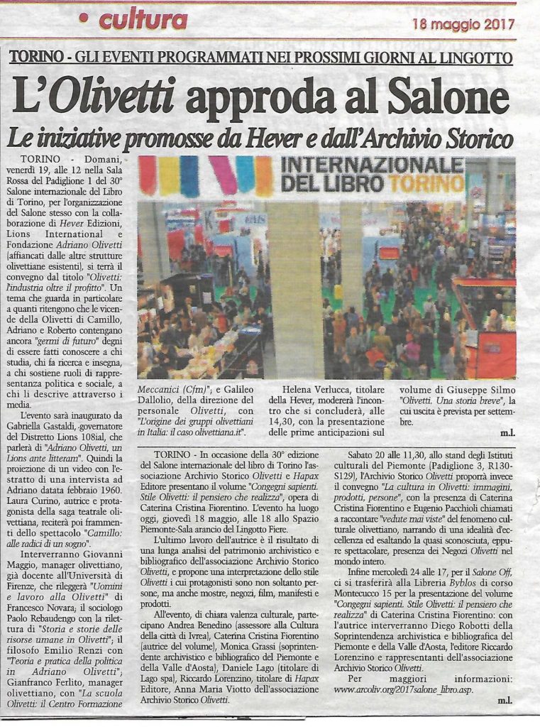 promosso da Hever Edizioni, Lions International, Fondazione Adriano Olivetti e con il concorso delle Spille d’Oro Olivetti.