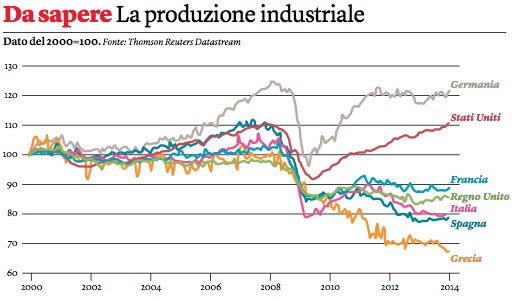 L’Italia è il secondo paese d’Europa per quanto riguarda l’industria manifatturiera, dopo la Germania. E all’interno dell’Ocse è uno dei paesi con la più alta percentuale di famiglie che vivono in una casa di proprietà. Inoltre ha un livello di debito privato relativamente basso. L’industria italiana vanta aziende leader nel mondo come la Luxottica, che fabbrica occhiali, e la Ferrero, che produce la Nutella. Eppure, tutti gli indicatori fondamentali che fanno girare l’economia vanno nella direzione sbaglia- ta. È un’economia che affonda e che degenerando potrebbe avere effetti sulla trasformazione della società simili a quelli della globalizzazione in Cina, India e Brasile.